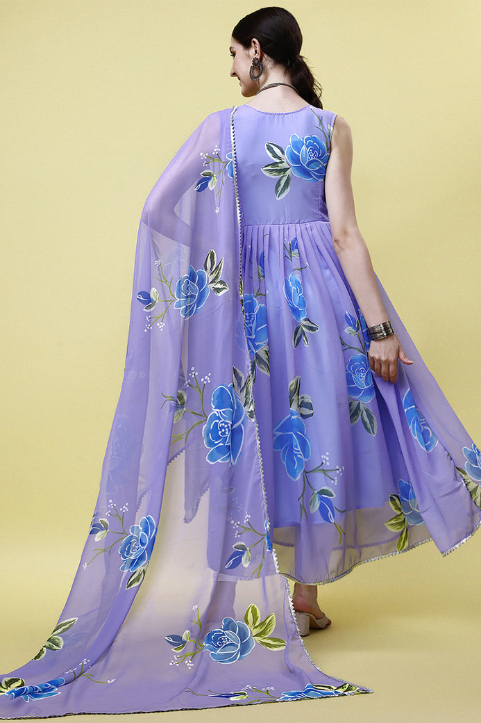 PRODUCT DESCRIPTION: Admyrin Lavender Georgette Printed Stitched Anarkali Gown with Dupatta