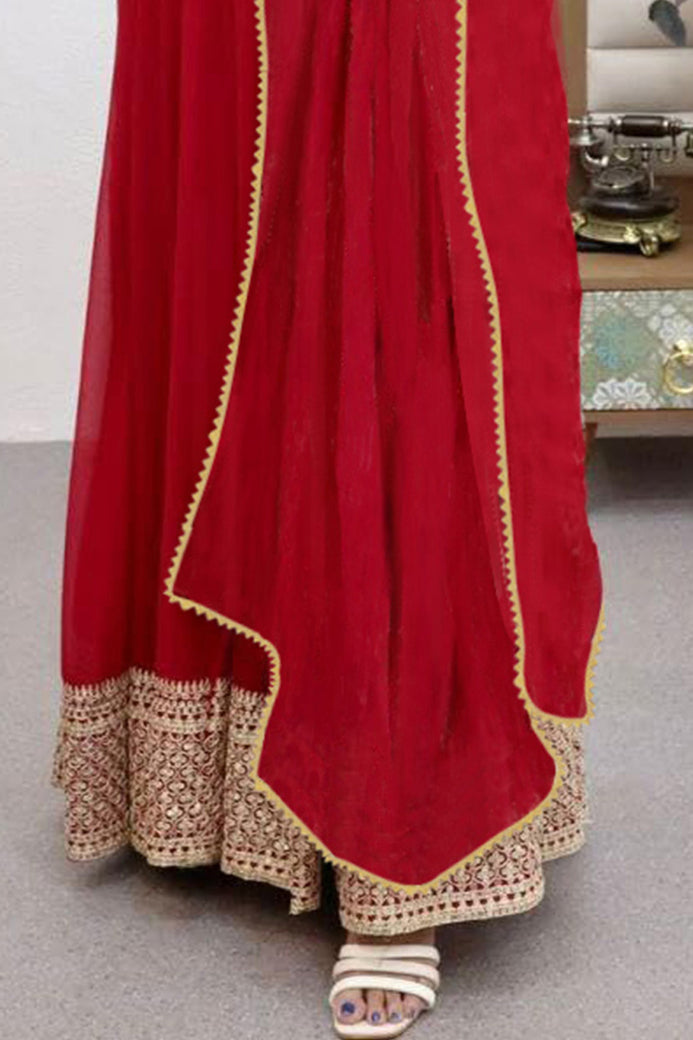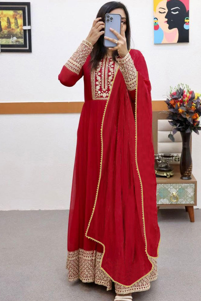 PRODUCT DESCRIPTION: Admyrin Red Georgette Embroidered Stitched Anarkali Gown with Dupatta