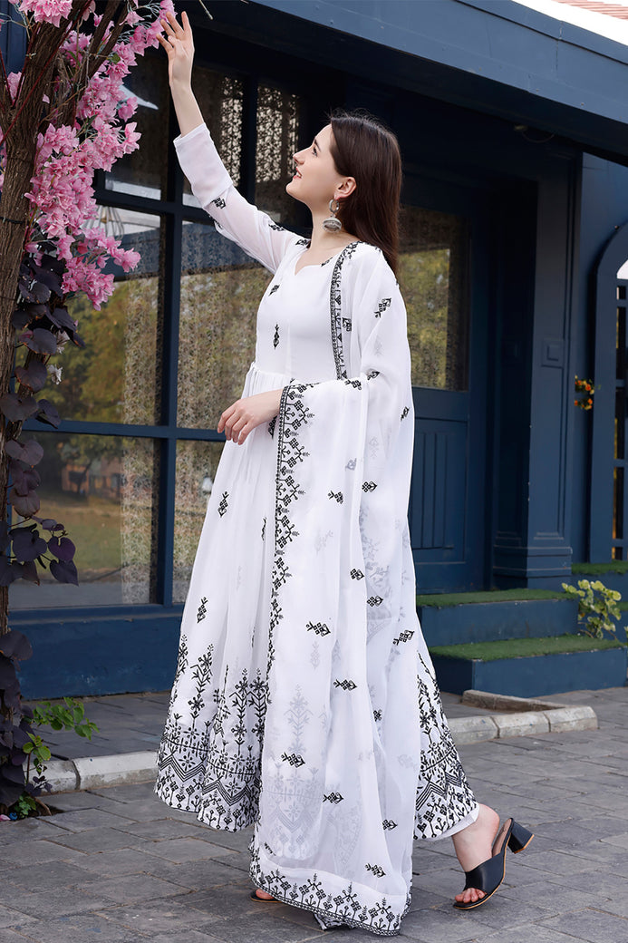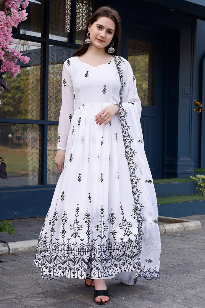 PRODUCT DESCRIPTION: Admyrin White Georgette Embroidered Stitched Anarkali Gown with Dupatta