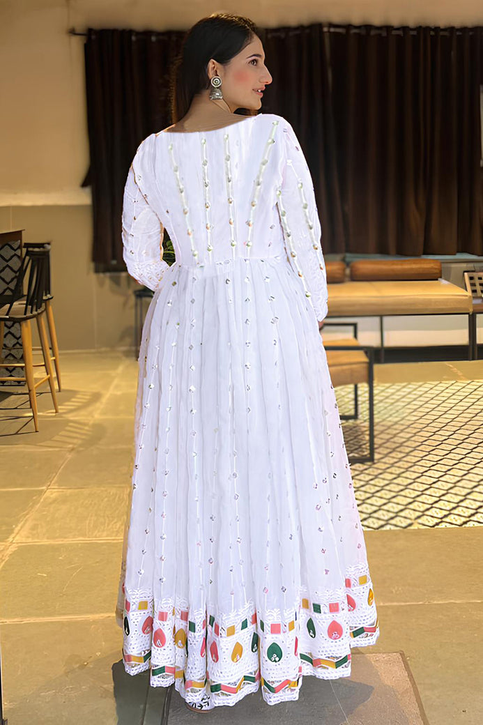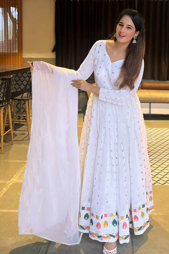 PRODUCT DESCRIPTION: Admyrin White Georgette Embroidered Stitched Anarkali Gown with Dupatta
