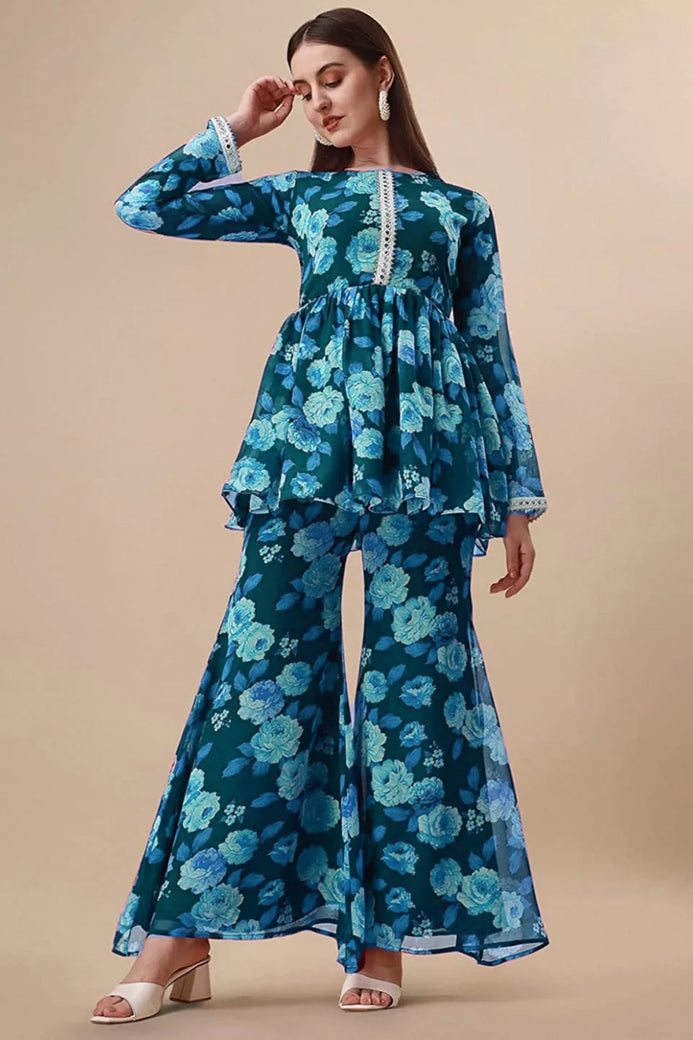 PRODUCT DESCRIPTION: Admyrin Rama Green Georgette Printed Designer Party Wear Readymade Top With Sharara
